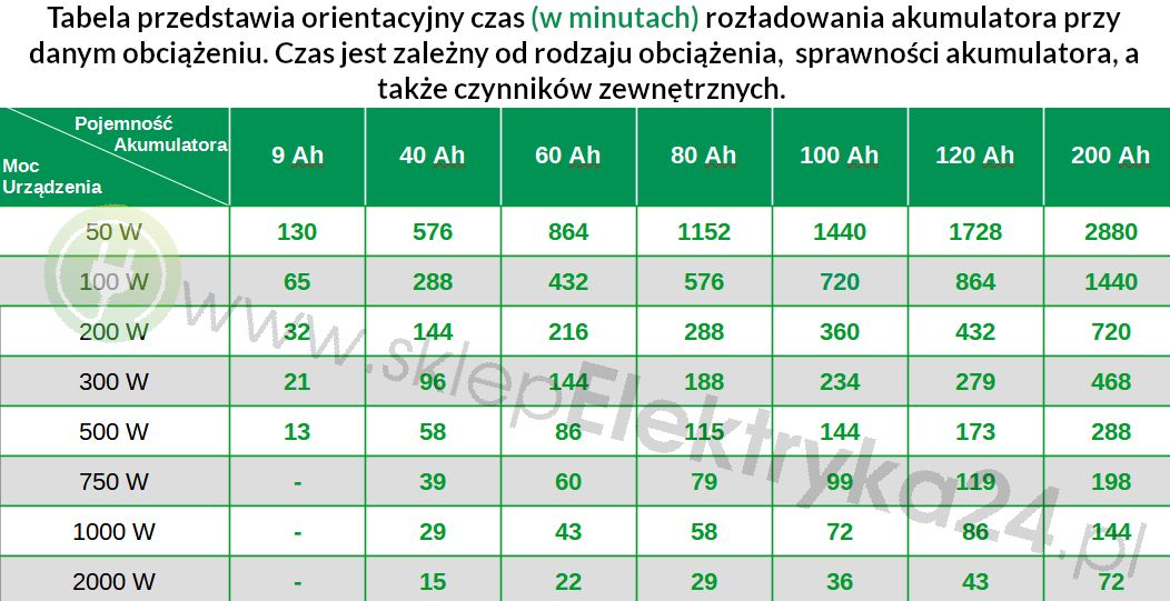Im większa pojemność (Ah), tym dłuższy czas pracy urządzeń. Pamiętaj, że podane wartości zakładają warunki optymalne i współczynnik rozładowania 1,8. W rzeczywistym środowisku (temperatura, wiek akumulatora, sposób użytkowania) czasy mogą być krótsze.